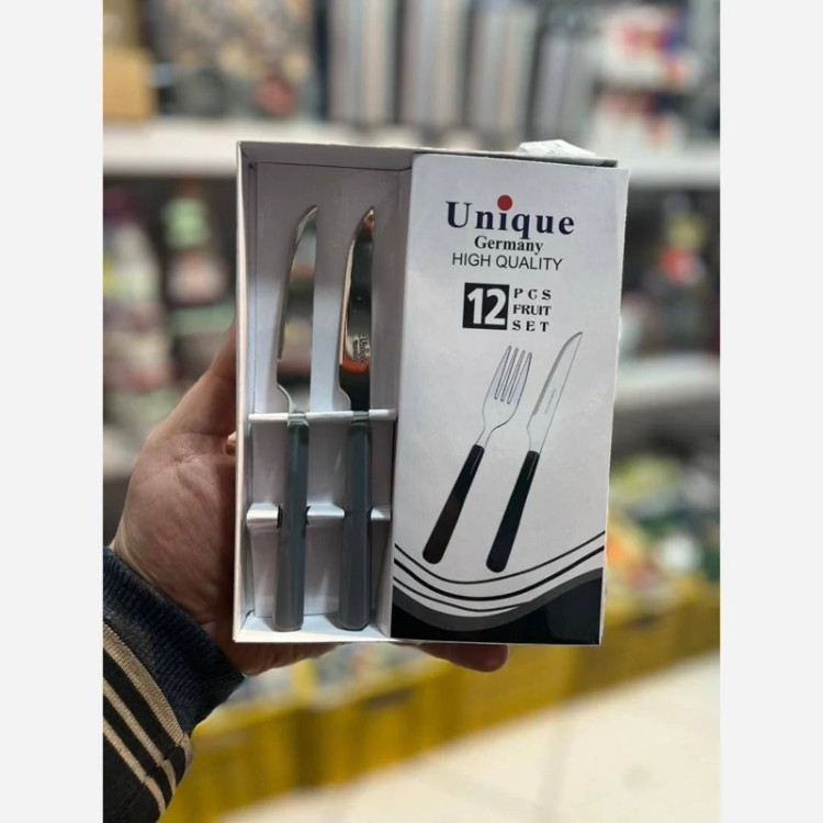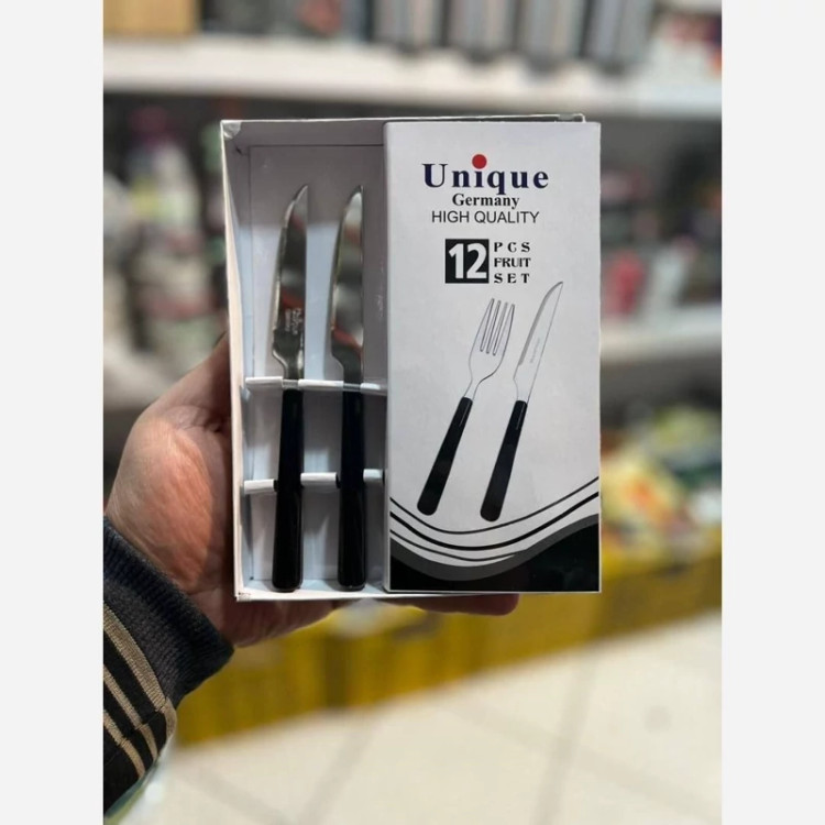 اگر میخواین تو پذیرایی مهموناتون خوش بدرخشید این محصولو از دست ندین😍😉 کارد چنگال وکارد تک میوه خوری🍏🍏🍐🫒🫐🍇🍍🥭🍊 برند Unique جنس تیغه استیل ضد زنگ درچهار رنگ مشتری محترم میتونید 12 عدد کارد انتخاب کند یا 6 عدد کارد+6 عدد چنگال