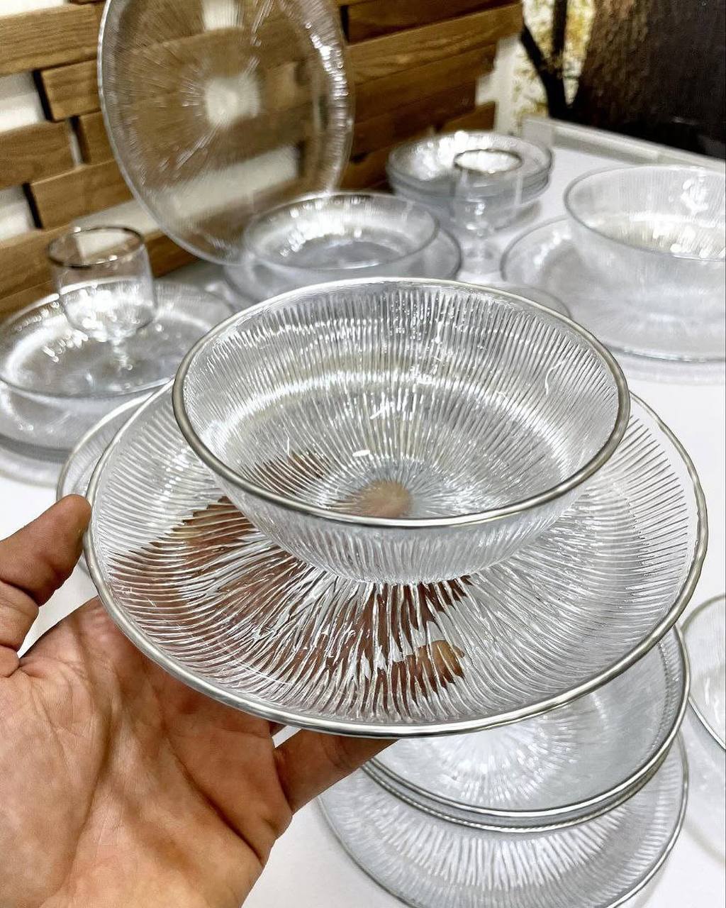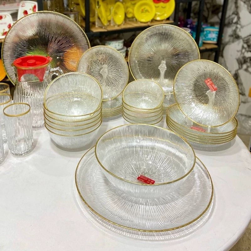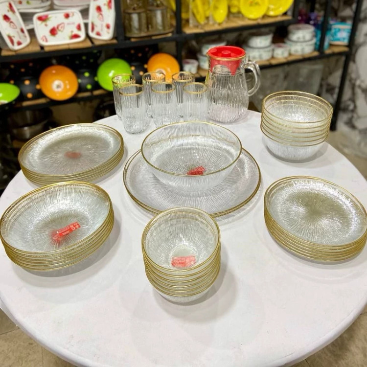 ست زیبای سولو پارچ و لیوان جزو سرویس نمیباشد قابل استفاده در ماشین ظرفشویی و ماکروفر نمیباشد ◀️ سرویس 33 پارچه غذاخوری solo لب طلا نشکن ◀️ فوق العاده زیبا و با کیفیت صادراتی ⏪بسته بندی عالی غیر قابل شکست 🛒 سرویس شامل 6عدد پیش دست،6 عدد پیاله ماست،6 عدد پلوخوری ،6عدد خورشت خوری،6 عدد کاسه سوپ خوری،یک عدد کاسه بزرگ 2عدددیس سرویس 33پارچه سولو لب طلا