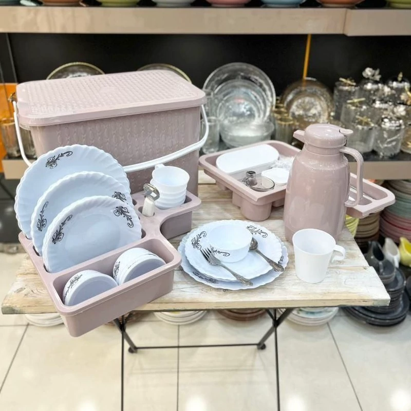 پك ظروف مسافرتی ٧٠پارچه تهيه شده از مواد اوليه شامل: ٦بشقاب پلوخوري ٦بشقاب خورشت خوري ٦پيش دستي ٦كاسه ٦ليوان دسته دار ٦قاشق استيل ٦چنگال استيل ٦قاشق چايخوري استيل ٣كارداستيل درب بطري بازكن قندان نمكپاش ظرف ميوه دربدار درب جدا شونده كه كاربرد سيني دارد سبد آبكشي فلاسك سايز٤٦*٣٦*٣٠ ارسال با سراسر کشور از طریق پست و به صورت پسکرایه