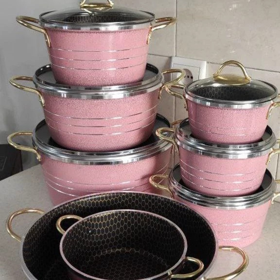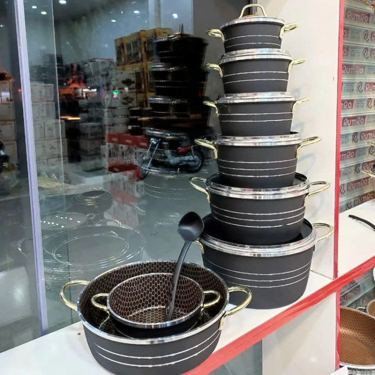 سرویس_قابلمه ۱۵ پارچه گلدانی 📌مارک پرتوکالا 📍پوشش داخلی زنبوری ✅دسته و سرپیچ طلایی 🌟این سرویس قابلمه به حالت گلدانی تولید شده به این صورت که قطر کف قابلمه نسبت به لبه اون باریکتر هستش ✅️سایز قابلمه ها: ۱۴ /۱۶/ ۱۸ /۲۰/ ۲۴ /۲۸ ✅️سایز تابه ها: ۱۸ /۲۸ ✅️بهمراه یک عدد کفگیر و شش درب پیرکس سوپاپ دار