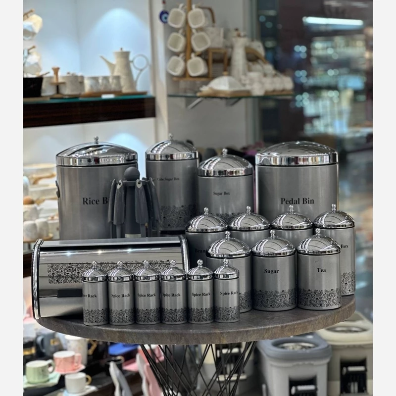بالاخره یک سرویس اشپزخونه کامل طراحی جدید در 4 رنگ جذاب و کاربردی ست 26 پارچه Full VIP جنس 100% ضدزنگ و آنتی باکتری دارای ده سال گارانتی شرکتی این ست زیبا شامل 👇 سطل زباله بیست کیلویی بانکه برنج ده کیلویی بانکه قند پنج کیلویی بانکه شکر سه کیلویی چهار عدد بانکه یک کیلویی حبوبات سه عدد بانکه نیم کیلویی حبوبات شش عدد بانکه مناسب ادویه ست کفگیر ملاقه با کیفیت بالا جاقاشقی استوانه ای جانونی فوق العاده زیبا